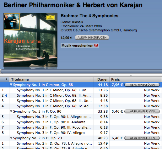 Interesting thoughts there. I love classical music, but I find the concept of buying single tracks of what would normally be multi-track works bizarre. Sure, we can buy the entire ‘work’, just as your screenshot of Karajan’s Brahms cycle, but as you pointed out, most of them are grouped as ‘albums’. Also, it is also unfair because the system seems to penalise classical-music listeners, as chances are, we’re ‘forced’ to buy multi-track works as it is common with classical music to span a work amongst multiple tracks.