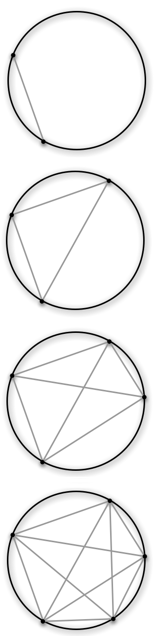 Essentially you start with a circle and put n points on it. Then you join each point to all other points using straight lines. The question is how many areas this divides the circle’s interior into for any given n. And to give an argument for the answer you find, obviously.