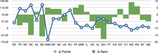 Unfortunately comparing the results to the prediction suggests things aren’t that easy. On the one hand it seems that Google’s model of distributing points used 35 contestants while the show on telly only had 25, hence their total scores end up being a bit high and need to be corrected in some way. It’s hard to find a good way for that correction. The obvious multiplication by 5/7 does improve things and I used it for my graph, but it’s not quite right. As Google don’t provide the points given by each country I don’t see how I can do better, unfortunateley. So here comes my graph of how far the points and final rank differ between Google’s prediction and the actual result: