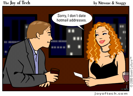 SummaryThe service offered by Hotmail certainly is among the more reliable on the Internet, although you might lose your address there overnight because your mates thought it was a funny thing to do when they were drunk. More importantly, you should be aware of the fact that by choosing Hotmail and giving your Hotmail address to your friends, you effectively say: 'I want to restrict myself to reading my e-mail in a web browser or using Microsoft applications. I do not want to be able to use more efficient applications for my e-mail and I also waive the possibility to easily change to a different provider for my e-mail.' |